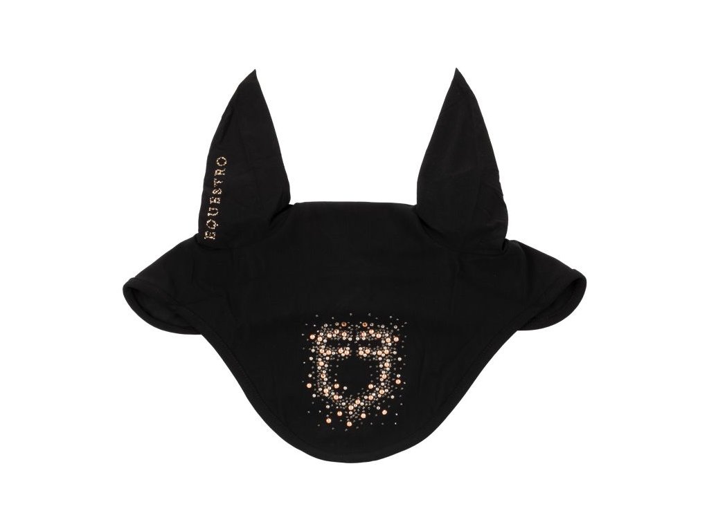 Čabraka ze strečového materiálu s výšivkou loga a ozdobnými kamínky. Prodyšný, pružný a elegantní doplněk pro koně, chránící uši před hmyzem.