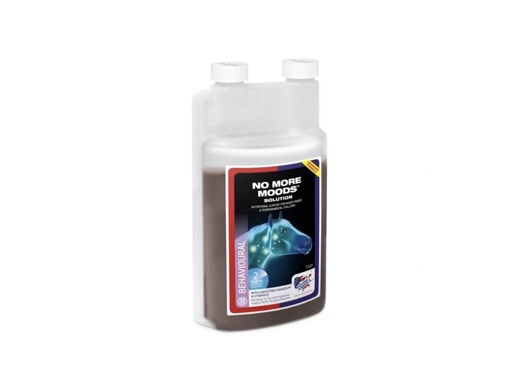 No More Moods™ je chutný tekutý doplněk určený pro klisny, valachy a nechovné hřebce, kteří projevují známky hormonální nerovnováhy – podrážděnost, svalové napětí nebo neochotu spolupracovat. Díky osvědčené kombinaci extraktu z drmku obecného (Vitex Agnus Castus), hořčíku a vitamínu B1 napomáhá udržení stabilní nálady, uvolnění svalů a zklidnění chování.