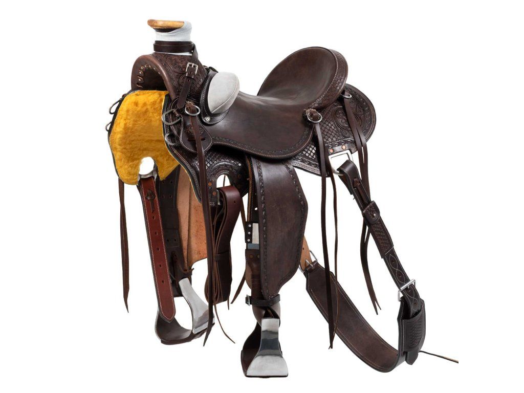 Kvalitní westernové sedlo typu Wade z odolné kůže s kompletní výbavou. Nabízí stabilitu, pohodlí a bezpečný posed – ideální pro práci s dobytkem i rekreační ježdění.